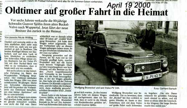 Natürlich nahm ich an, dass der Buckel in den 30 Jahren seit 1963 mehrere Besitzer hatte, aber erst einmal den ersten herausfinden. Ich entdeckte eine lokale Tageszeitung in der nordschwedischen Stadt Umeå und faxte die deutsche Geschichte des Buckels aus Umeå dorthin. Roger Römberg, Motorjournalist von Västerbottons Kuriren, gefiel die Anfrage und ahnte eine Geschichte dahinter. Wir telefonierten und Roger fragte alles über den Buckel, über mich und meine Leidenschaft zum Volvo PV 544. Roger Römberg recherchierte und fand alles über die Chassis Nummer 401534 heraus: am 31. 10. 1963 hat er das Werk Göteborg verlassen, Auslieferung nach Umeå am 1. November 1963. Am 8. November hat Olof Sjölin den Wagen angemeldet. Versichert bei „S-Bolagen“. Aus späteren Erzählungen weiß ich, dass der Buckel im April 1964 erstmals von Herrn Olof Sjölin und seiner Frau Gunvor gefahren wurde, als der letzte Schnee verschwand. Auch fand Roger Römberg heraus, dass Gunvor nach dem Tod ihres Mannes Olof nach Östersund umgezogen war, mit dem Buckel.