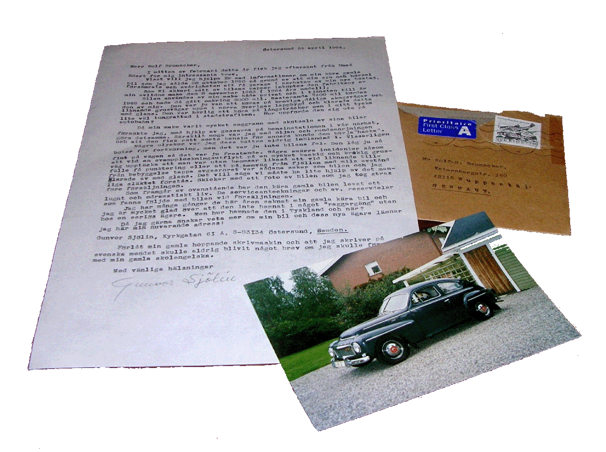 Sie schrieb mir auf einer alten Schreibmaschine in schwedisch, eine norwegische Freundin meiner Mutter übersetzte ihn mir - es war ein herrlicher Brief! Sie schilderte ihre Freude, als Roger Römberg über den Verbleib „ihres“ PV in Deutschland berichtete. Schweren Herzens habe sie den geliebten Wagen wegen „nachlassender Seh- und Hörkraft und der Tatsache, dass sie in der Nähe ihrer neuen Wohnung keine Garage gefunden habe“ verkauft und dabei Sorge gehabt, „dass der Wagen in schwedische Rockerhände gelangen könne“. „Protokolle wegen zu hoher Geschwindigkeit habe sie auch bekommen“, schrieb sie weiter, „aber der Wagen hatte eine so gute Straßenlage, dass ich einfach in Versuchung kam“. Beigefügt war das letzte Foto des Buckels, bevor er nach Deutschland gebracht wurde. Gerne würde sie weiter über ihren Wagen informiert, weiter auf dem Laufenden gehalten werden. Und dies tat ich natürlich gerne!