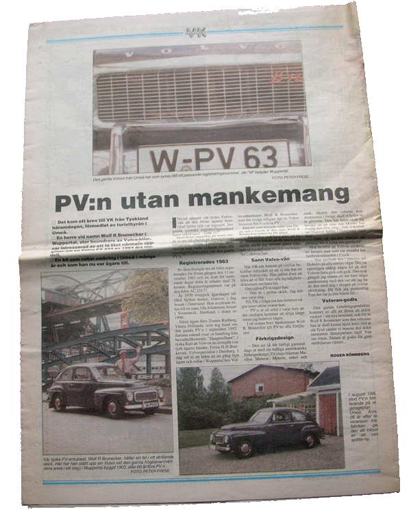 In Västerbottons Kuriren erschien im Mai 1994 ein ganzseitiger Artikel „PV: n utan mankemang“, übersetzt: „PV ohne Makel“. Dazu sandte mir Roger Römberg einen dicken Umschlag mit Kopien der schwedischen Zulassungsstelle, vom ersten bis zum letzten Tag, als der Buckel in Schweden fuhr. Daraus ging hervor, dass das Ehepaar Sjölin der einzige Besitzer des Volvos mit der Registrierungs-Nummer 401534 war! Dass das etwas Besonderes ist, wurde mir jetzt klar.